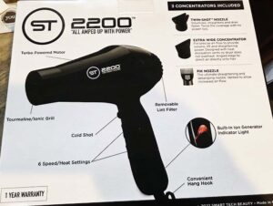 ST2200 PRO IONIC HAIR DRYER: The ST2200 “All Amp up ” Dryer works to make hair looking softer, silkier, and smoother than ever before, while providing the healthiest, fastest, and longest-lasting styling results. Crushed tourmaline jewels are infused into the dryers components, developing an electrical charge when heated, producing far-infrared heat that helps the hair dry at a 60% faster rate. Th negative ions cause the larger water molecules to break down into smaller droplets, allowing more water to be absorbed and retained in the hair.Moisture and natural oils are gently sealed into the hair for a conditioned, smoothing effect, thus permitting light to be reflected off a smooth surface making the hair appear shinier.